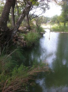 Water from the previous night’s rain trickled out of the cedar breaks through very thin soil on top of a continuous layer of limestone. It collected in a depression and ran down the gentle slope, finally cascading over rock smoothed by millennia of trickling water. The rock had been warmed by the August sunshine, and when it finally reached the swimming hole, it was noticeably warmer than the crystal clear water into which it cascaded, with irregular but consistent tinkling. At the edge of the hole an old live oak tree clung to the bank with half of its original root structure, the other half having disappeared when the soil beneath was scoured out by a succession of floods. One root still grasped a piece of limestone it had grown around, as if to defy the disappearance of the rest of the foundation the tree had once relied on.