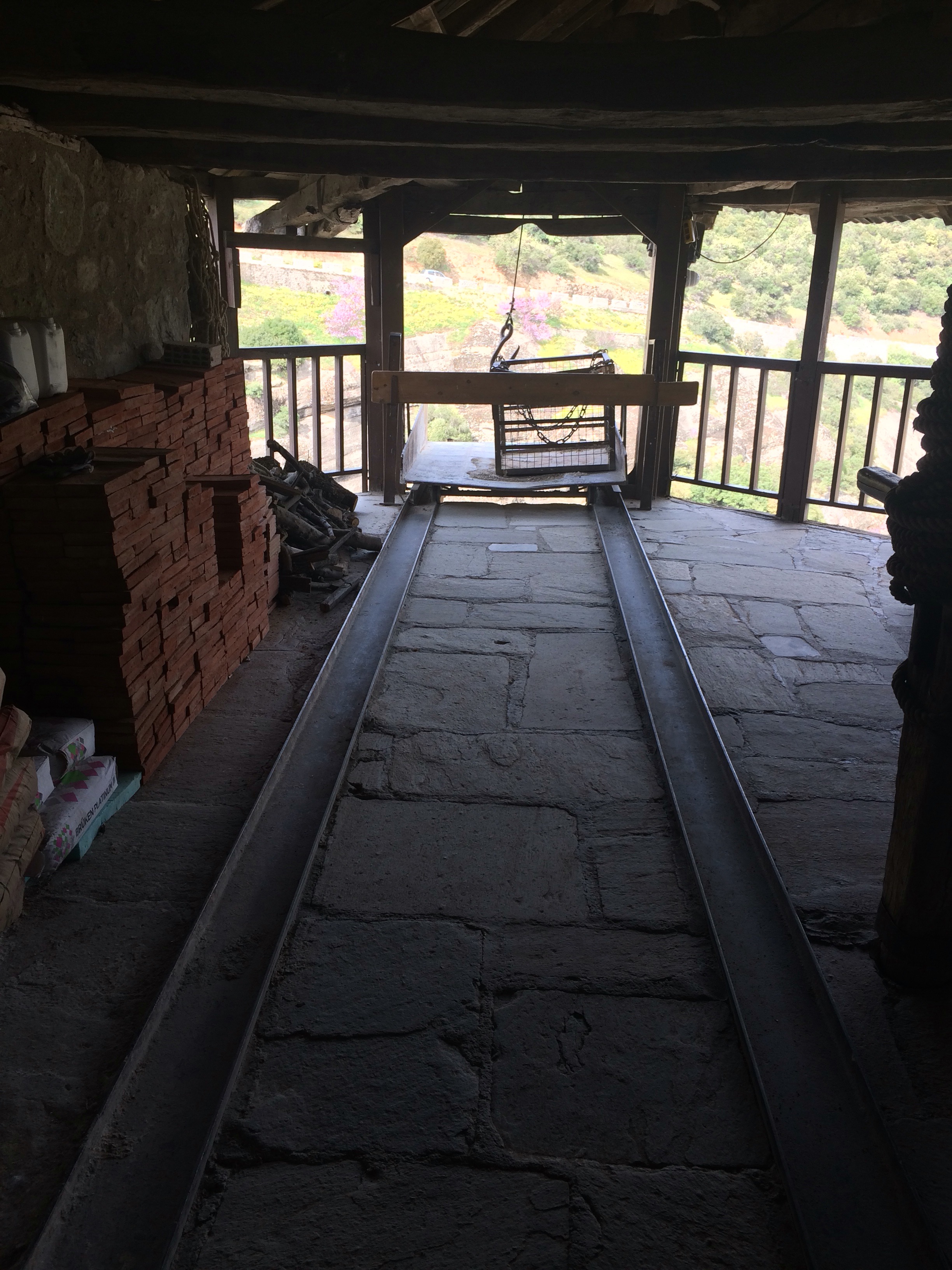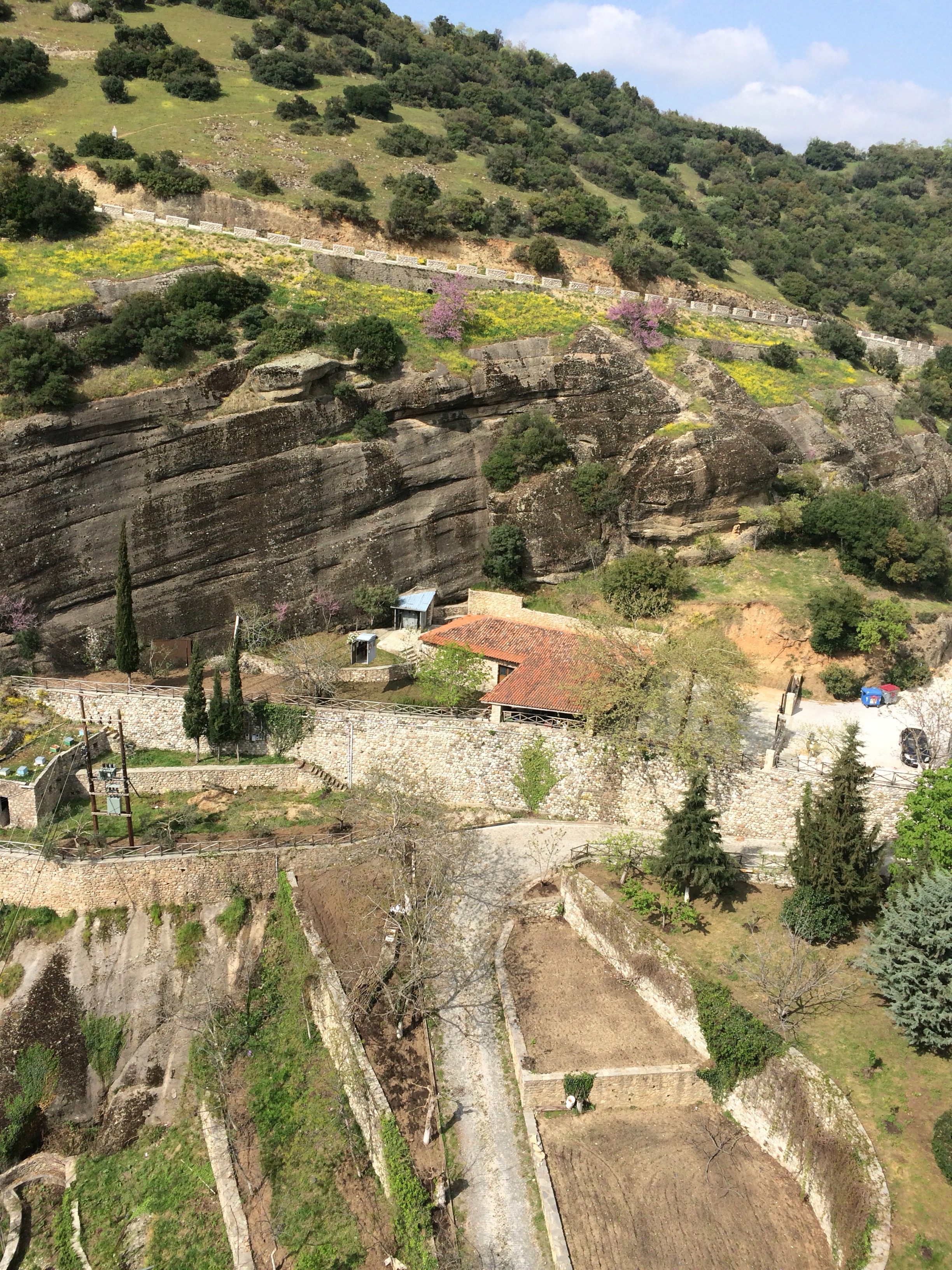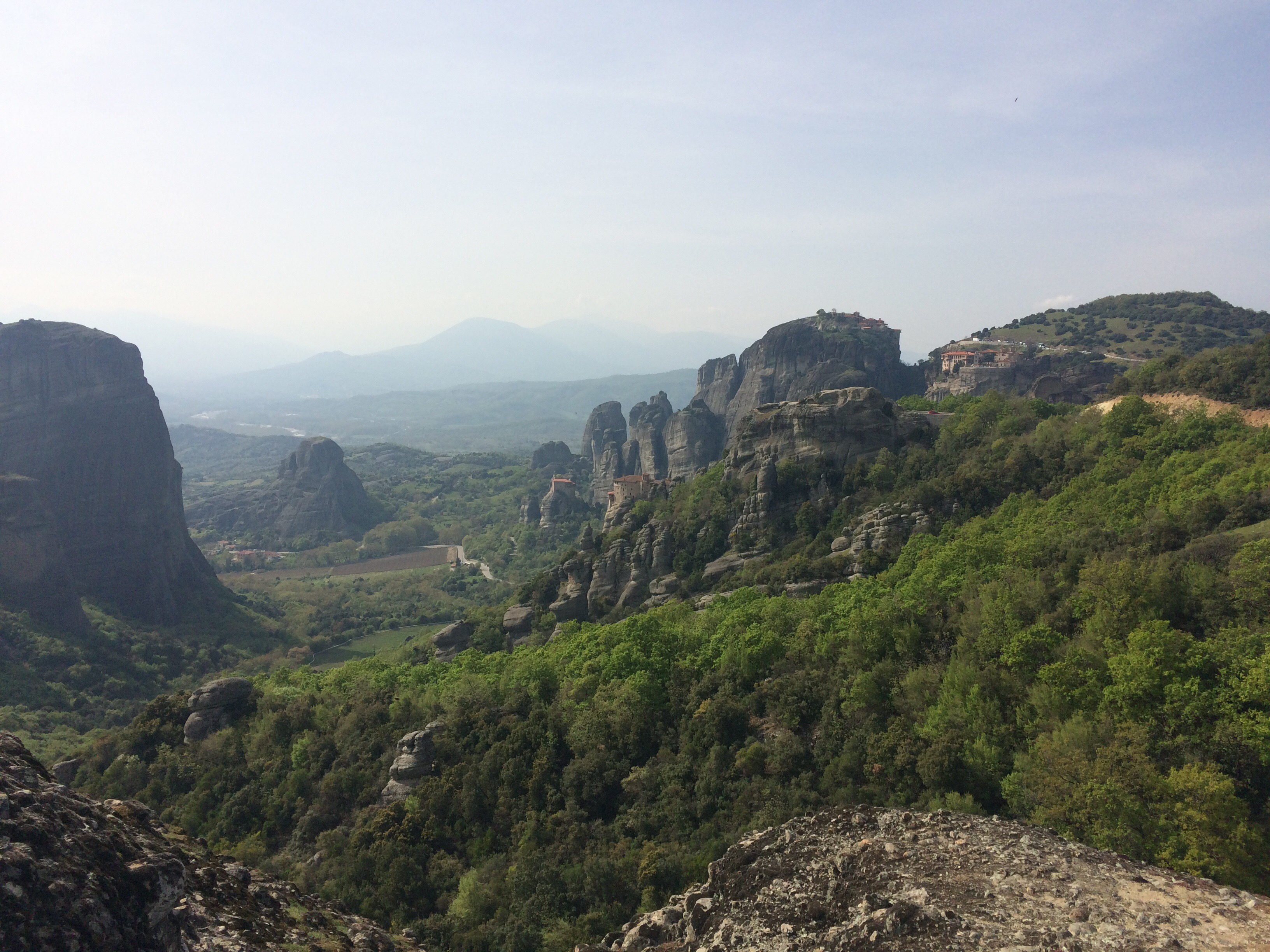 Beginning in the 1500’s Greek men built monasteries in the mountains of rock near Meteora. First were hermits living in natural caves on these vertical columns of conglomerate rock, but before long others built structures on the tops.