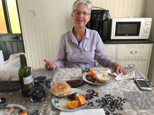 We walked several miles of boardwalk on the beach. No restaurant open around here so we got vino tinto at a bar next door and found a great pairing with oranges, bread, and chorizo purchased in Porto. We aren’t as far as most hikers but still walked 17 km today. We found an apartment on Maps.me- rented out of a restaurant which was closed on Mondays. The owners saw us looking in the windows and let us in, said we could have a room for €50 but would we mind if they finished lunch first? (In Portugues. Plus they were in the middle of a soap opera). While we waited they gave us water and homemade chocolate cake. Then she drove us here in her car and said she would pick us up for breakfast at 8:30 am. We haven’t even paid or given our passport info to her yet. Sweet people!