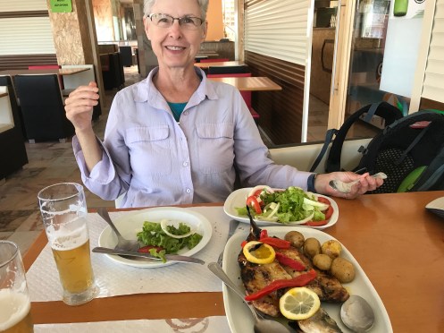 We had a real seafood lunch – charcoal grilled sea bass. Best meal we’ve had on this trip!
