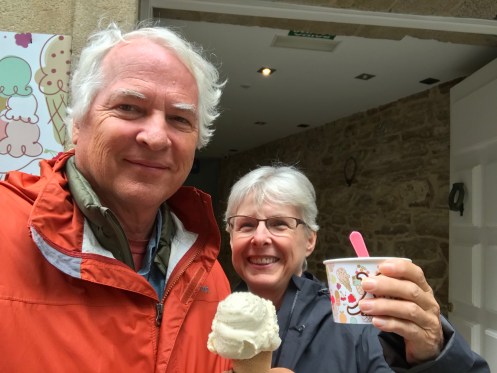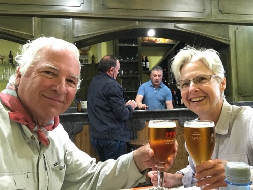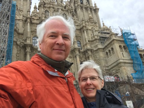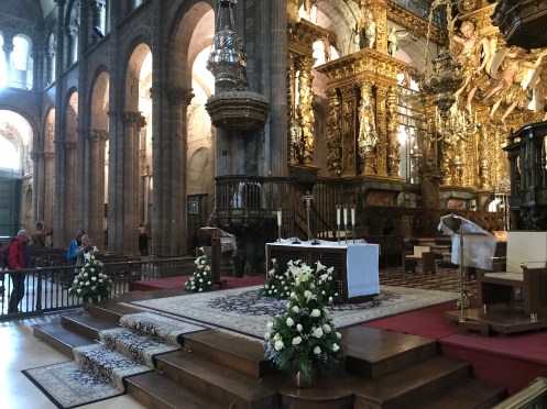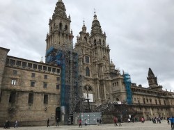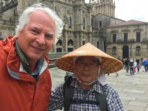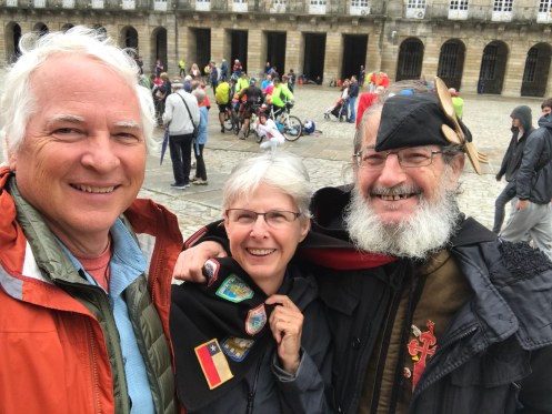 We arrived in Santiago de Compostela yesterday early afternoon feeling beat up by 20 or more kilometers of trail. We had to walk quite a ways to find lunch. Squid, rice, and beer. We found our way to the hotel for a nap, then to the Cathedral. We found some interesting people, including this member of the university choir we saw last year. Bought the CD, of course. Met this Japanese pilgrim whose friends signed his hat along the way. Went to the Pilgrim Mass at noon. I saw that lots of the changes I had suggested last year (in a letter to the archbishop) have been incorporated. We also found the Austrians for a post-mass beer or two. We are meeting for dinner at 7. Fig ice cream (delicious) then off for a nap. We will need to be rested up for dinner.