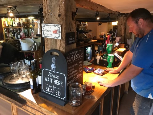 Quaint and picturesque merry old England! 🙂 But in the pub it looks like that American customs are creeping in: I’ve never before seen the sign “please wait here to be seated” in a British pub.