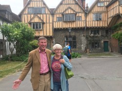 The England of your imagination exists in a place called Winchester. The couple in the photo are friends Gillies and Kym, who stayed at my Airbnb last fall. They have been showing us around. We took a guided tour of Winchester Cathedral. Our guide, Harry, told the history of the area from the Romans forward with a twinkle in his eye. The tour was one of the best hours we spent on this trip.We took a walk on a public path with our friends and learned that these are called kissing gates. There were quite a few so there was a lot of kissing. Famous trout fishery Itchen River flows through This area. We have seen quite a bit of the beautiful stream, but no trout. Izaak Walton wrote “The Compleat Angler” near here in 1653. This perfect cottage was across from the rural pub we found food and drink after our walk. There were many others along the way just as pretty. Our bill for breakfast yesterday came in this book. We went to church tonight at St Mary’s across the green from our AirBnb. A dozen people and a good message. One of the highlights for me.