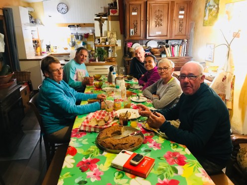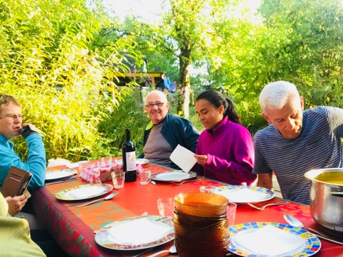 This albergue 16 km before Conques is by donation. We all 5 helped make supper of pumpkin soup, ratatouille, Truffade, all from scratch. 3 hour dinner, best time ever.