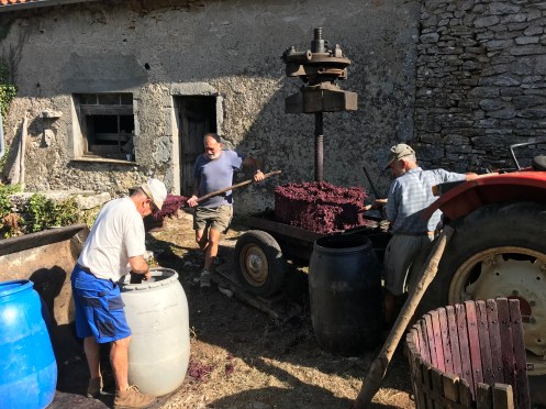 Here some men outside of Faycelles have crushed grapes the old fashioned way and are taking the remainder out of the press. My friend said this used to be a big wine production area, but that a disease from the United States killed all their vines. I assume this was Pierce’s Disease.