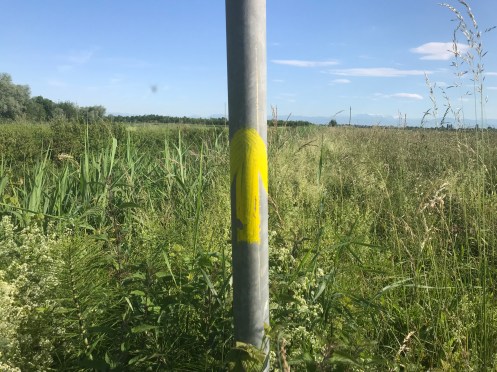 The most interesting part of the trail today was along a riverbank. The grass was sometimes taller than me and the only trail was some beaten down grass showing that a person had recently walked here. About 1km.