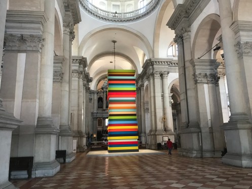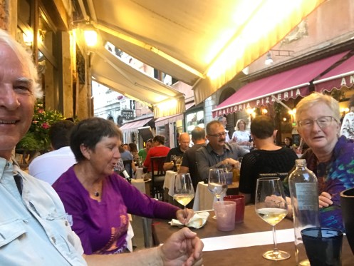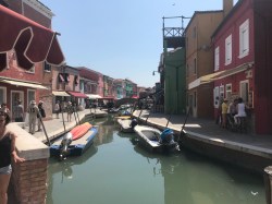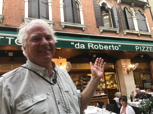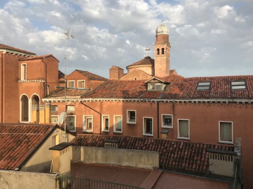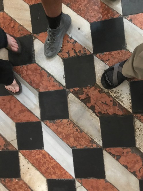 We toured a church with an “art installation” which was hard to reconcile with the huge canvases by Tintoretto. (I don’t have any photos of his or other canvasses because lighting wasn’t good enough.) Tintoretto paintings are found in many of the churches in Venice. There is a restaurant/bar every few feet. This restaurant was fun partly because the manager is crazy. Scary crazy. W avoided eye contact. But that made it memorable. I’d rather say the food made it memorable. We had excellent Italian food in the villages back up the trail, though. This is a flat floor in a church. Clever!The view from our hostel rooftop. Venice keeps to just a few colors, and these are predominant. Murano, famous for its glass artistry, has a wider range of colors. Burano, not pictured, has lots of brightly colored houses. And hordes of tourists. This is not me, but we kayaked the canals one evening. Pretty cool way to experience Venice, good young tour guide. Did not take a gondola ride. I’m glad I spent time in Venice, and Tyler was a fantastic guide. It may be a once in a lifetime experience for me as there are so many other places I want to go. Our hostel was €100 each for the three nights, so it is affordable. If you don’t mind the bathroom down the hall and no air conditioning!