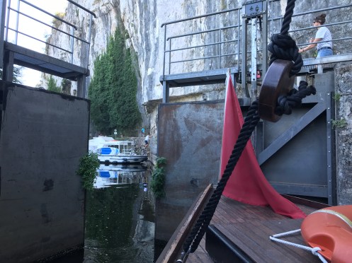 We took a ride on a ship built in the tradition of the barges which plied this river for hundreds of years. Originally pulled by people, then horses, and the towpath was carved into the canyon wall. We went through a manually operated lock.