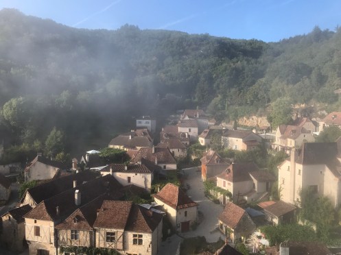 We were out of food options today; no stores or restaurants on our route. We came to a very small village and stopped for a rest at the church. We had already done 10 km and lots of up and I needed a break. We tried the door but the church was locked. But a man came from the house across the street and unlocked it. It was a simple but beautiful church. And we knew there was a gite in the village, our trail friends Jean Luc and Veronica had stayed there. So we found the gite and asked if she could make us a sandwich. With all the fancy food we have from time to time, this was fabulous. St Cirq de La Popie is usually crowded with tourists. But at sunrise I looked out the window and saw that a thick fog had formed over the river. This doesn’t always happen, but it did for us. Our early morning walk through the village was just us and a few locals. Most people remember narrow streets crowded with people. We will remember the quiet in fog, and Jackie the wood turner.