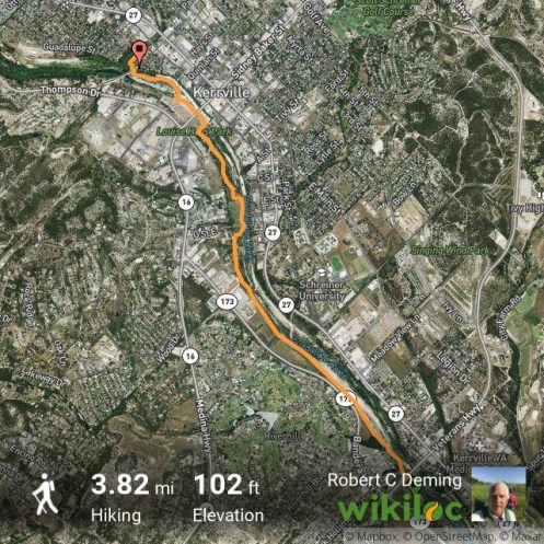 UPDATE: I walked the Kerrville Riverside Trail again, this time dropping a car at Riverside Nature Center and parking the other car at Kerrville-Schreiner Park. The trail guide didn’t mention this, but there is a free parking lot at the Kerrville-Schreiner Park accessed off of Veterans Highway (Loop 534) via Legion Crossing Road East. If you park inside the park there is a fee, although it is only $2 for seniors. There is a locked gate between the park and the free parking lot, and you are given a code for the gate when you get your entrance permit. It is much simpler to park in the free parking lot. The distance was 3.8 miles total, the first two miles were the same 10 foot wide paved trail; although the scenery wasn’t as spectacular as the western section, it was fine and lightly travelled.