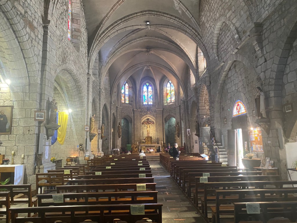 The first section of this trail is hard, with steep ups and downs every day; several days we gained 2,500 feet in the first couple of hours. Some days we walked a mere 10 or 12 miles, some days 20. The weather was perfect for walking, and we only needed our rain gear on one day late in the trip. The condition of the trail in France is generally very good, and when we walked on paved roads, there was little or no vehicular traffic. Most often the vehicles were slow-moving tractors with courteous drivers. The first part is called the Aubrac, and the scenery includes high, windswept plateaus, where the trail goes between low rock walls and wildflowers. As with all of this trail, there were always far more cows than people.