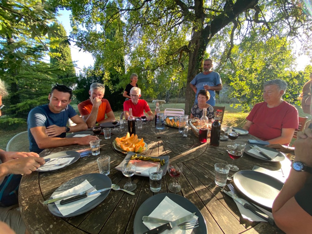 Lodging on the trail includes hotels and chambres d’hotes and bed and breakfasts, but most nights I’ve been able to stay in hostels called gites d’etape. Guests are primarily walkers, and typically they have beds for 10-15 people. Sometimes all the beds are in one room, sometimes only two or three beds, and sometimes you can have a private room. There is often only one bathroom for all the guests. I always arrange for a bed the day before, three or four days before if it will be a weekend in a popular tourist town, by calling the host on the phone. You don’t give a credit card number; I just tell them I’m Robert from Texas. We usually arrive at 3, and the host has you sit down at a table outside and brings you water with flavorings (that is a European thing, I’ve never seen it elsewhere). I think they are getting you to chill out and cool down. I take off my boots as they are not allowed inside and put on my after trail sandals. Then the host, who is often making preparations for dinner, comes and sits down at the table with you.