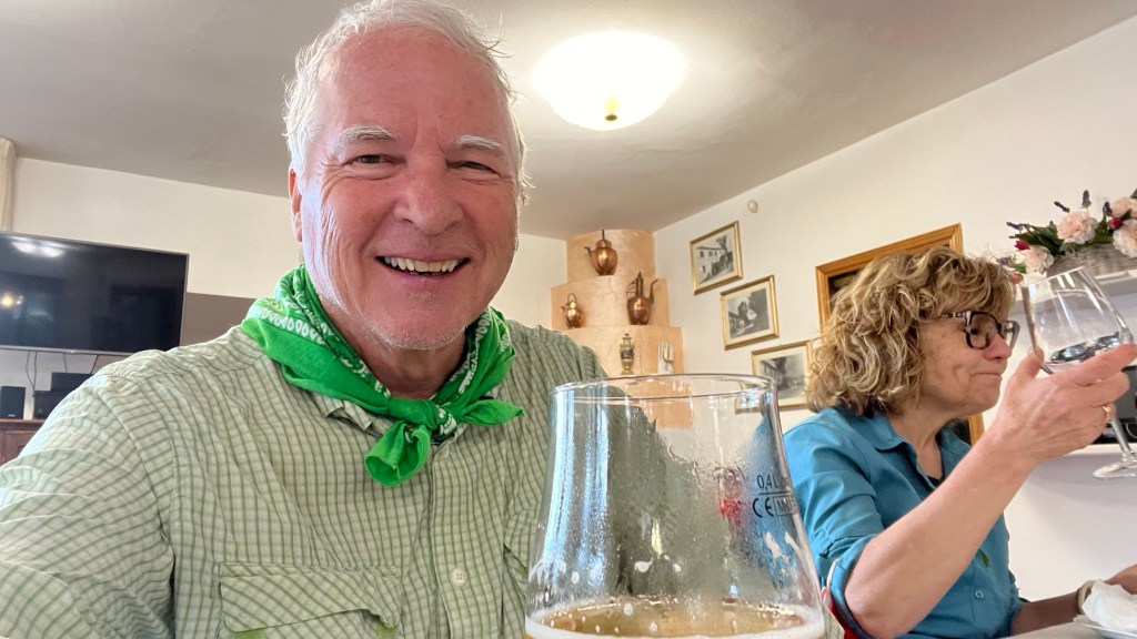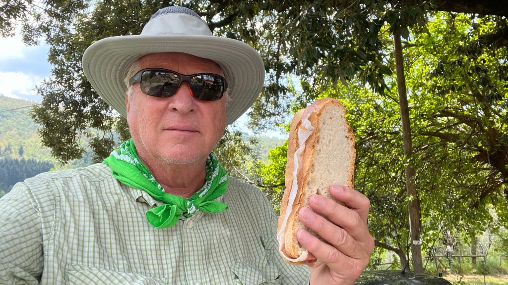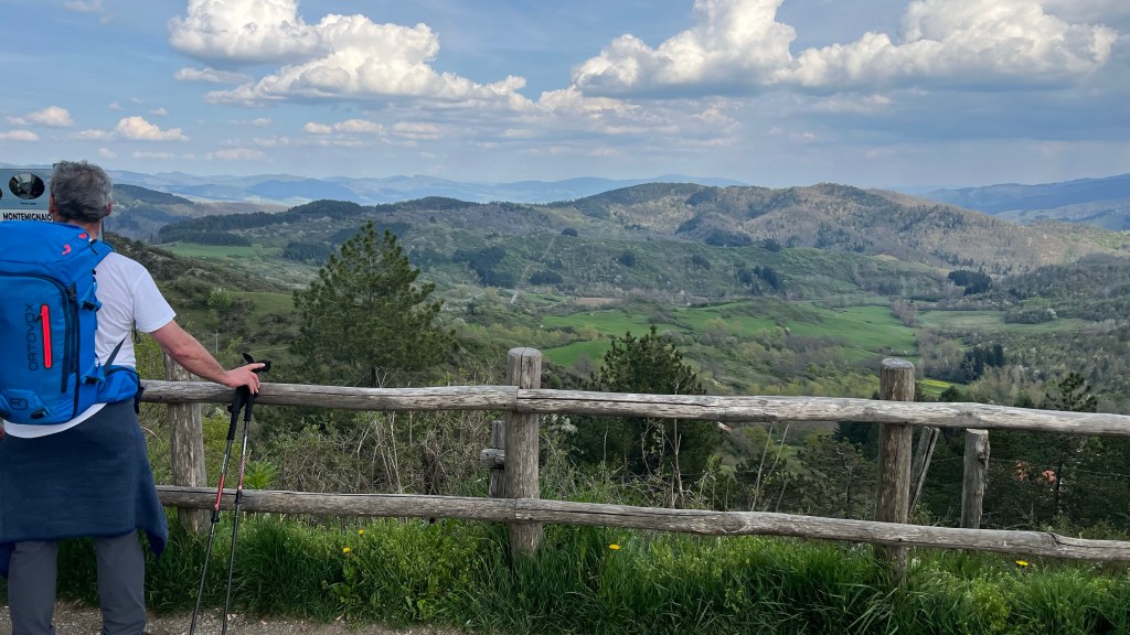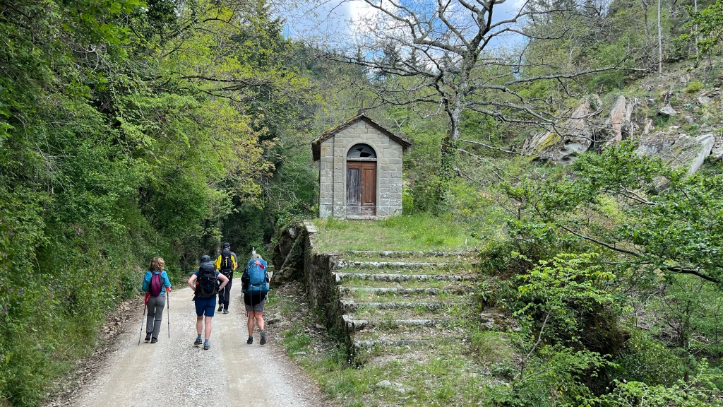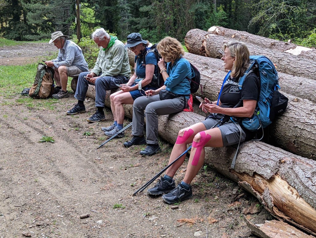 We did 1020 m meters (3,300 feet) of up today, and about 15 miles horizontal. It was a hard day, but not painful! The weather was great, and we were in vineyards, Olive Groves, then forests of tall pine trees.