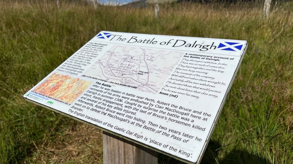 Here in 1306 two warring Scots clans fought a significant battle. Robert the Bruce was the leader of the losing side. Nothing remains from the battle despite archaeological examination. There was lots of violence between clans in this area.
