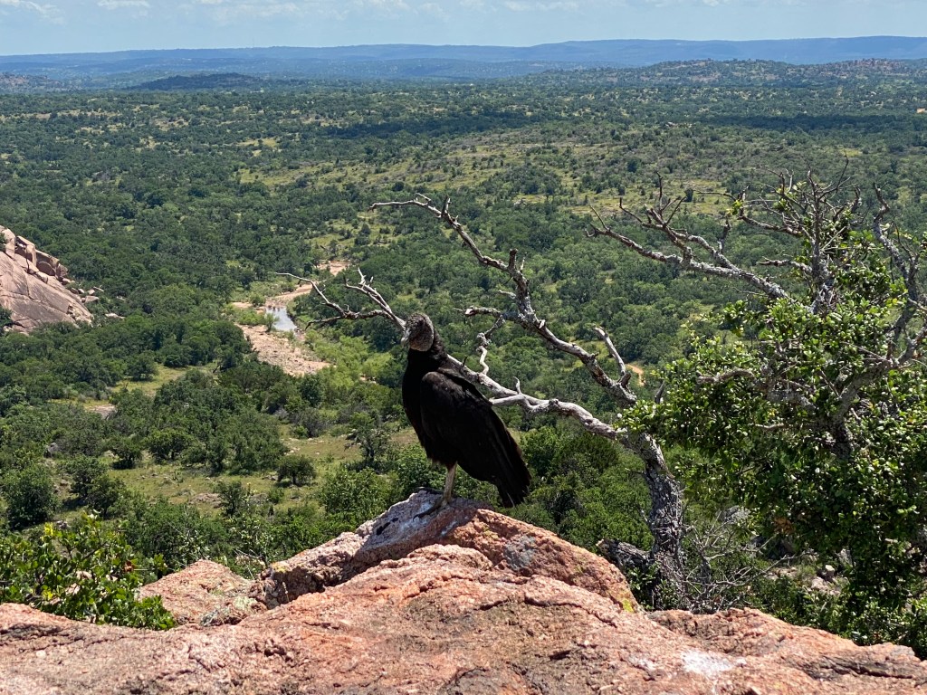 Black Vulture on top of Turkey Peak. High Point #4. This is not hard but it is steep, and a nice little summit. This bird landed without regard to me, and this is the closest I’ve been to a vulture. My Enchanted Rock Red novel has a Turkey vulture named Clairice as a character.