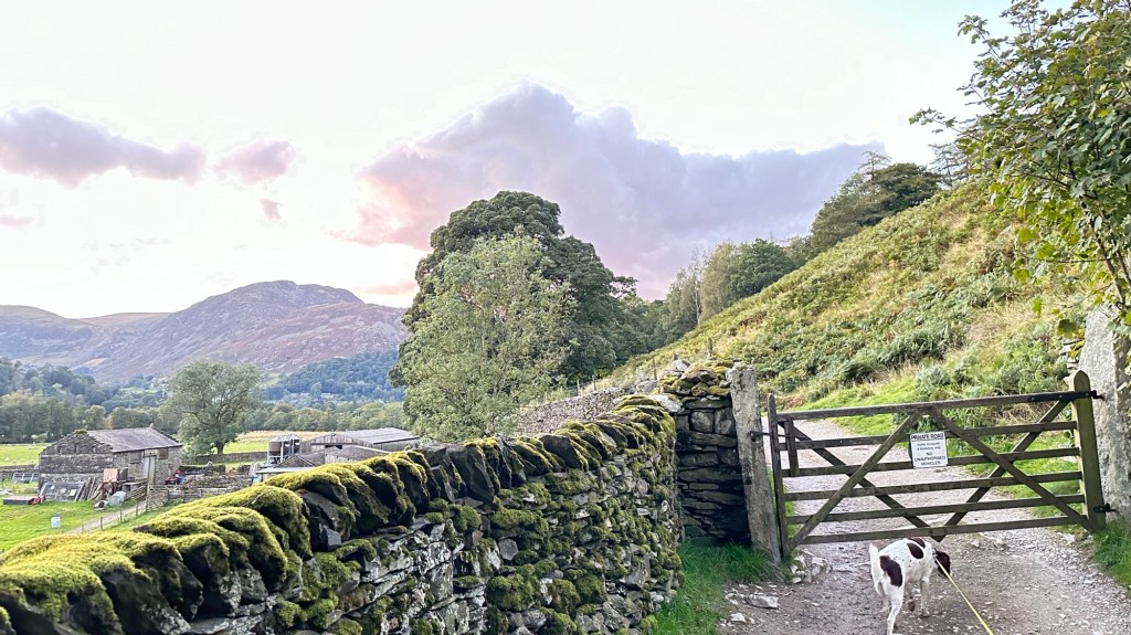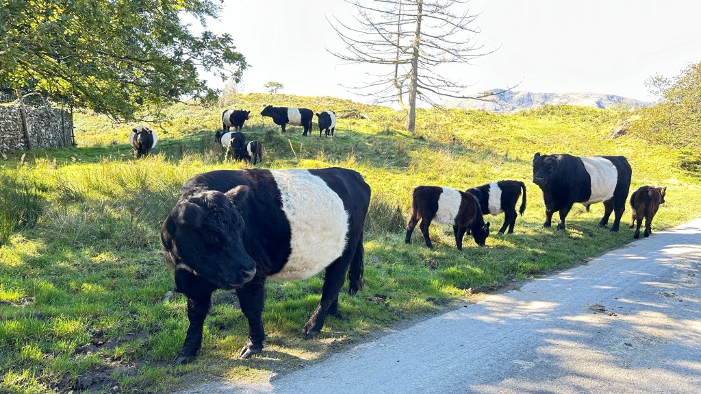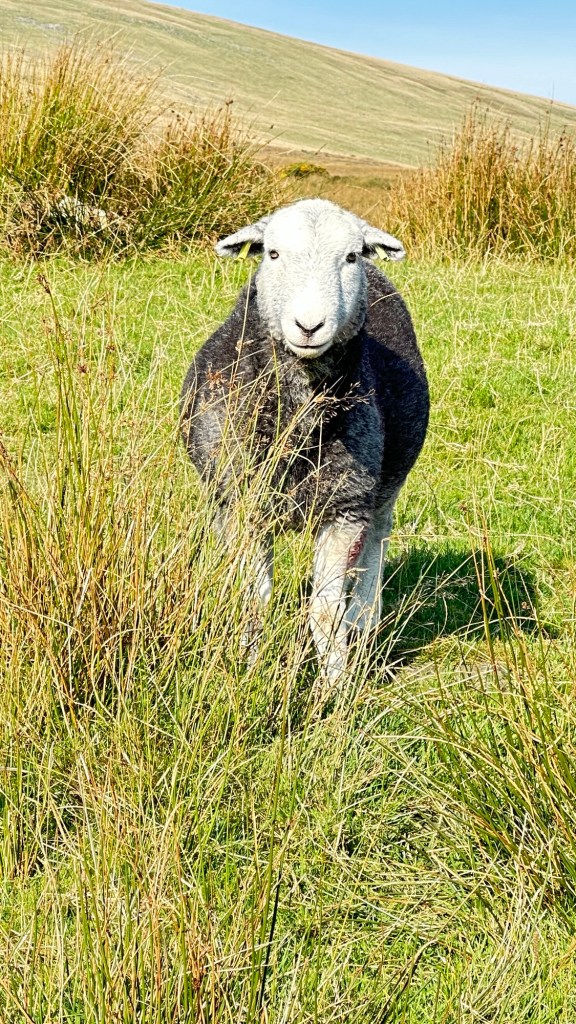 Across the valley was another mountain, not as tall as the ones behind us, but tall and steep. It was also crisscrossed with rock walls, even high up on the impossibly steep sides. These mountains do not resemble the American Rockies at all – instead, they look more like big lumps of green pistachio ice cream, with steep sides, called fells in the local language, and lumps and some parts melting and others with rocky outcroppings. On the fell opposite was a chaotic scene: a couple of hundred white and black sheep milling around over a wide distance. It was quarter mile away and we could not make out all the details, but the two shepherds were easily identifiable, and we could even hear their shouts. Small black dots zipping around the periphery were border collies. The dogs, at least seven or eight of them, were ranging all over the mountain in search of stray sheep. It looked like utter chaos, but soon the sheep were organized into a steady line, all moving in the same direction, and then quickly through a gap in the wall and down to their winter pasture in the dell.
