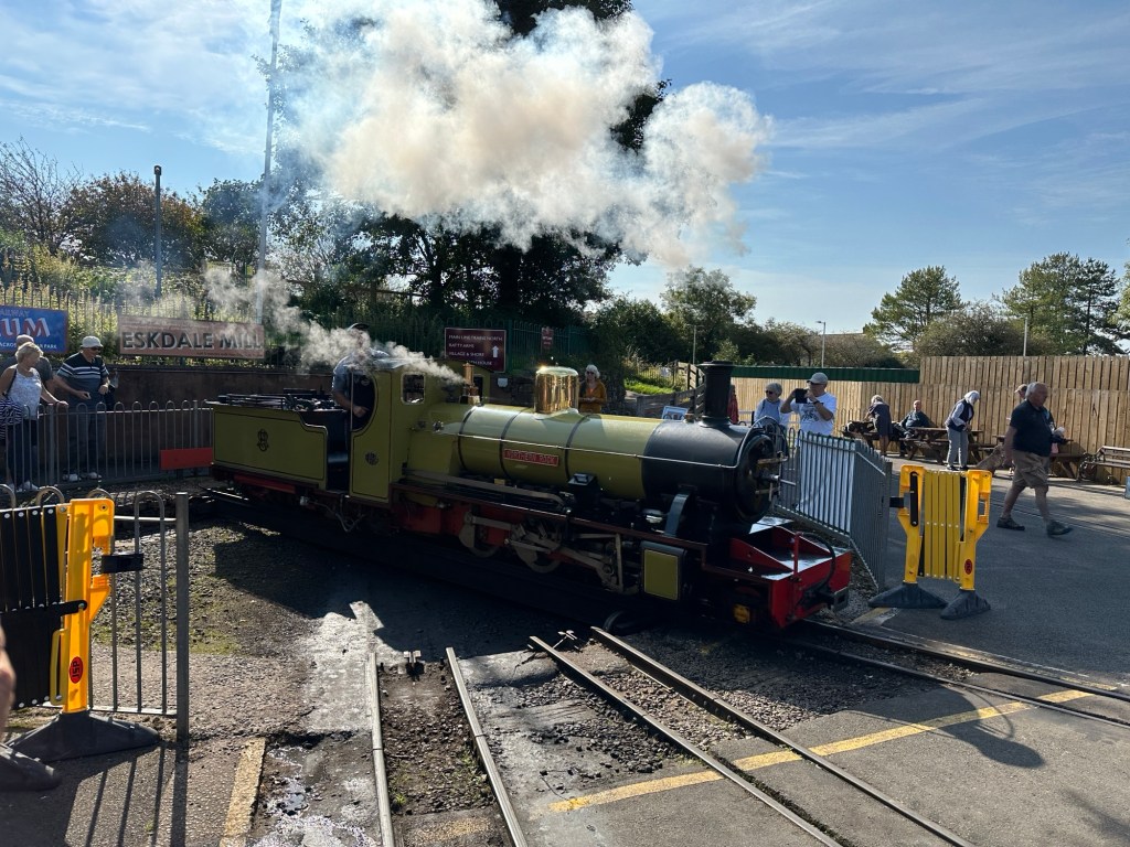 A camper told us about a railroad trip, which we did today. It’s a real train and local railway from 100 years ago, but it’s quite small. Top speed is about 20 mph and the entire route is 7 miles. There are tiny “stations “ along the way where walkers catch the train to make combinations of walking and riding. The scenery was beyond charming. We ended up at Ravenglass, a second century Roman village on the Irish Sea. Isle of Man is not far away. The train westbound was coal-steam powered, coming back was die (but still 100 years old).