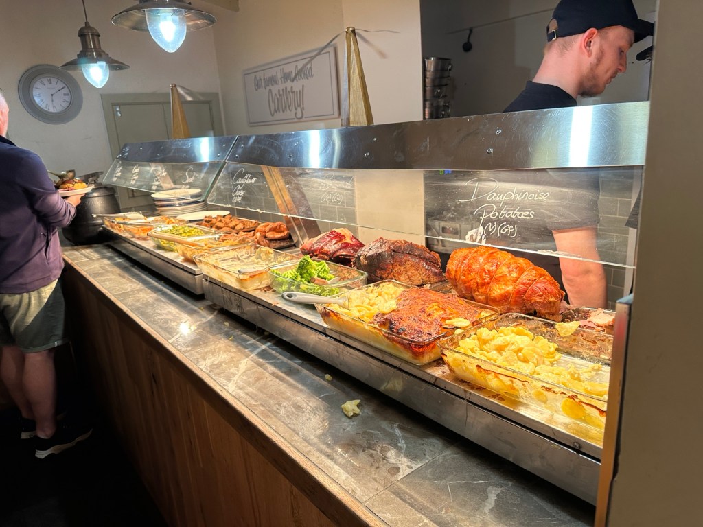 We are in an Airbnb in the village of Rookingham. The pub is 100 yards around the corner. We are cooking tonight, but I think it would have been necessary to book a table to eat there. Sunday night at 6, and it’s full. I like to visit pubs because we just don’t have the equivalent.