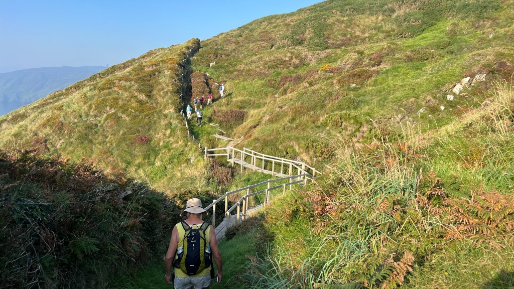 14 mile day 2100 feet of up and back down again over Snaefell in the rain, tall grass, Heather, swamps. and rocks trails.We arrived at Ramsey at 6:45, 10 hours into the day, tired, but happy. i finally got a beer, and fish and chips. Last day Monday.